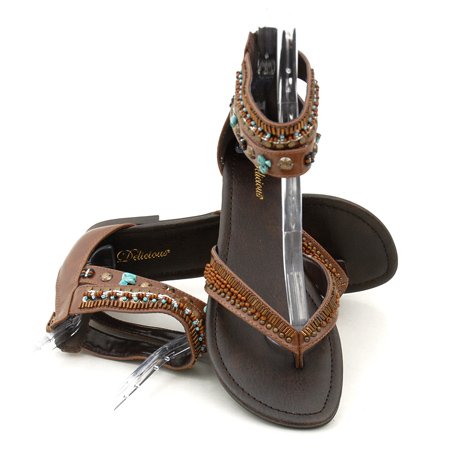 Boho chic! Slip on thong flat with beaded accents. Ankle cuff strap; zipped up in the rear.