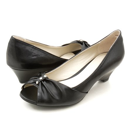 A new look! Low tapered kitten heel. Open toe design; knotted accent.