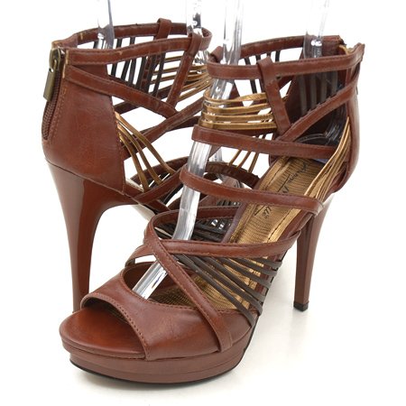 Elegant style! High platform with a tapered heel. Overlapping strappy design; zipped up in the rear.