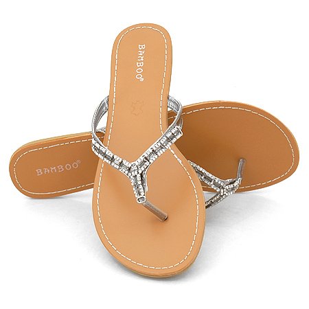 flats dont have to be boring! Easy to wear slip on thong design; accented with rhinestones.