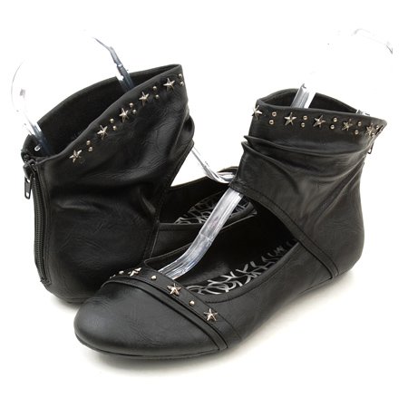 A cute round to flat with a zipped up ankle cuff. Stud detailing.