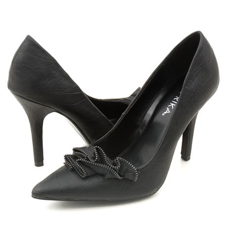 Dress it up! Pointy toe pump with a tapered high heel; zipper accented ruffle toe.