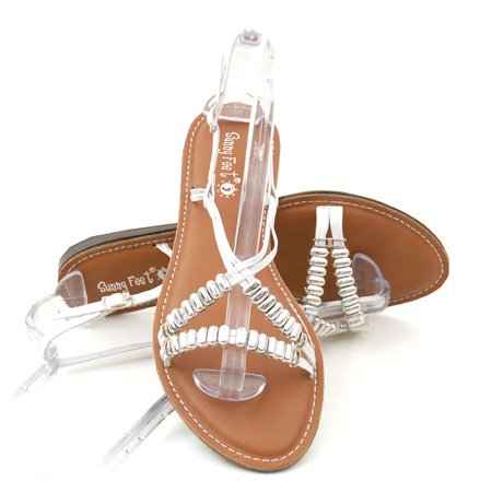 A fun, easy to wear flat! Overlapping strappy design with metal hardware beads.