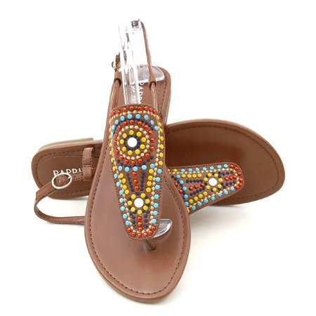 Boho chic! Multi-color beaded accents; slip on thong design with an adjustable anklestrap.