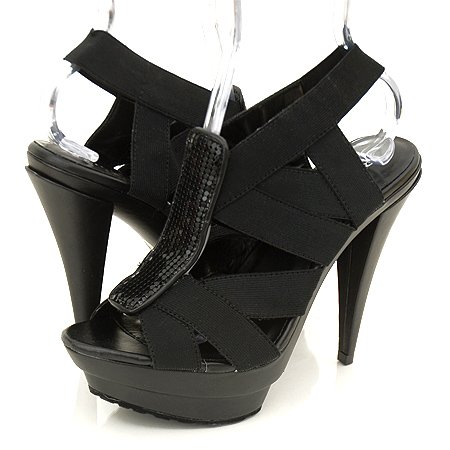 Stay on the fashion edge! Platform base with a cone high heel. Banded upper; T strap band with a reflective accented top.