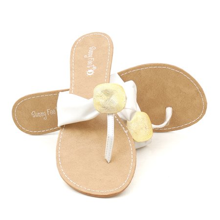 How cute! Slip on thong design; banded strap with a metal ornament accent.